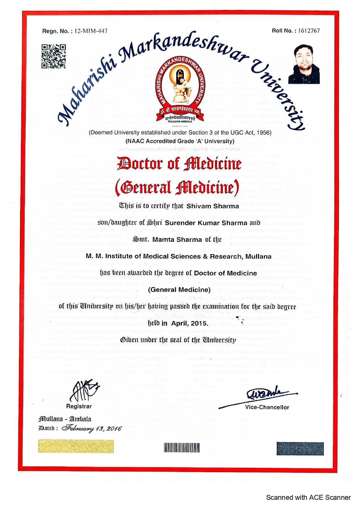 MD (Internal Medicine): From Recognized Indian Medical College (MMU MULANA COLLAGE AMBALA)
